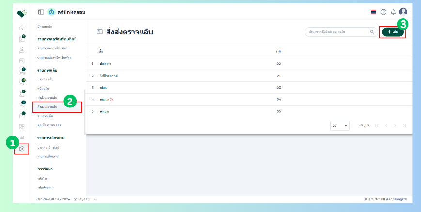สิ่งส่งตรวจแล็บ สามารถเพิ่มสิ่งส่งตรวจแล็บได้ตามขั้นตอนดังนี้เข้าไปที่ตั้งค่าเลือกหัวข้อสิ่งส่งตรวจแล็บกดเพิ่มจากนั้นใส่ชื่อและรหัสตามที่เราต้องการและกดบันทึก