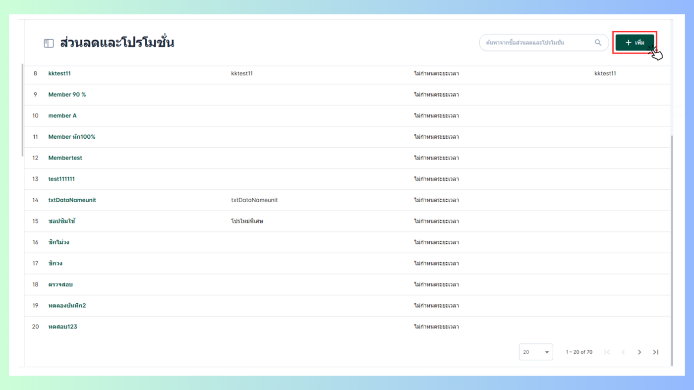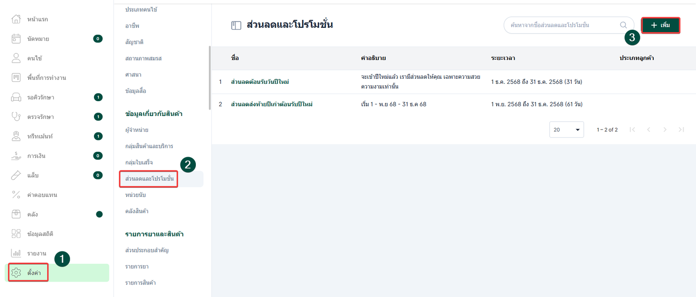 เมื่อผู้ใช้อยู่ในหน้าส่วนลดและโปรโมชั่นคลิก +เพิ่มที่มุมขวาบน