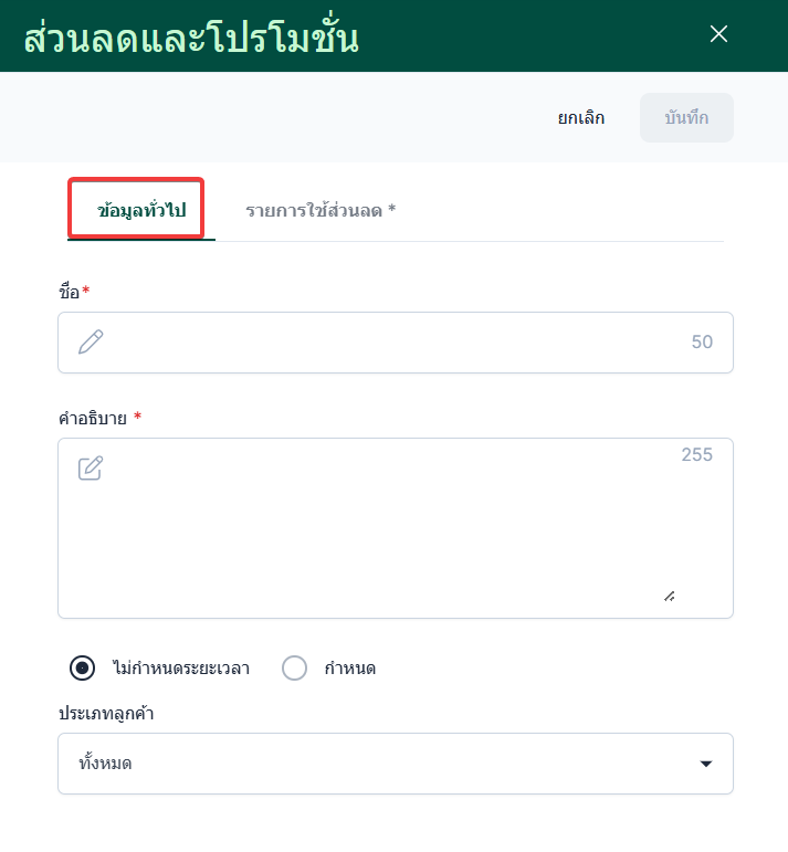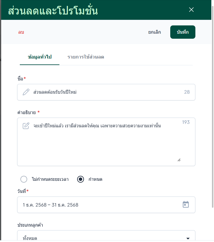 ผู้ใช้งานจะเข้าสู่หน้าเพิ่มส่วนลดและโปรโมชั่น ข้อมูลทั่วไปกรอกชื่อ คำอธิบาย สามารถกำหนดระยะเวลาและเลือกประเภทลูกค้าได้