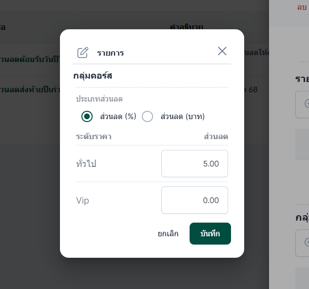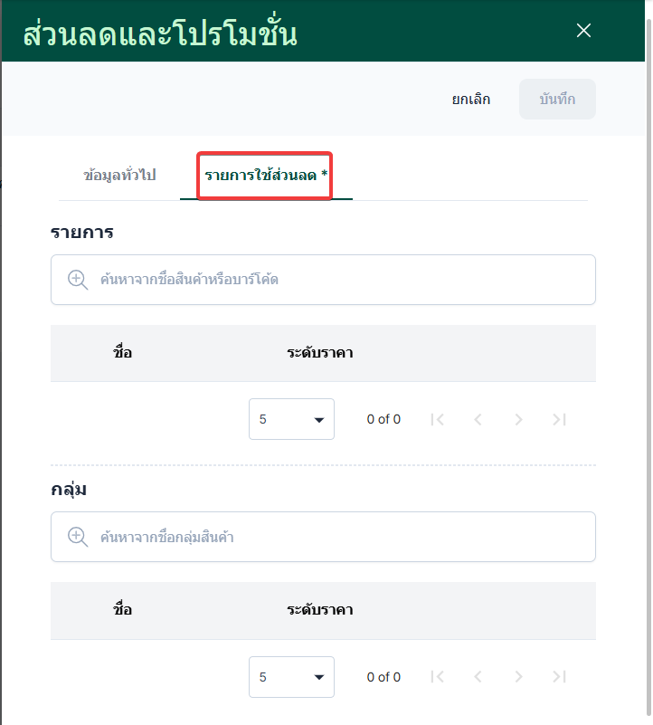จะมีหน้าแสดงรายการให้กรอกรายละเอียดสามารถเลือกประเภทส่วนลดและระดับราคาได้