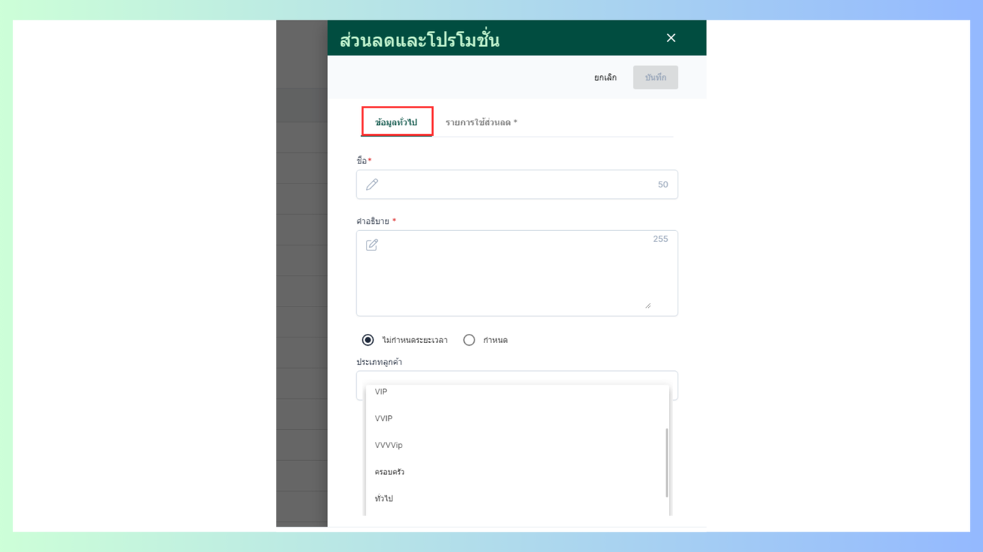 - ผู้ใช้งานจะเข้าสู่หน้าเพิ่มส่วนลดและโปรโมชั่น ข้อมูลทั่วไปกรอกชื่อ คำอธิบาย สามารถกำหนดระยะเวลาและเลือกประเภทลูกค้าได้