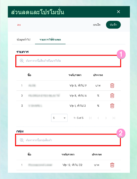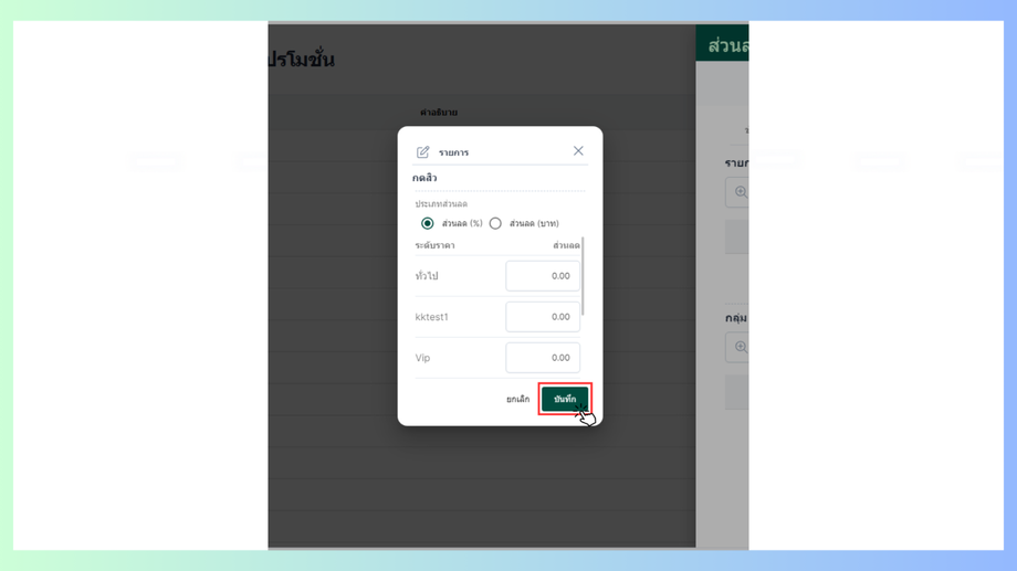 - จะมีหน้าแสดงรายการให้กรอกรายละเอียดสามารถเลือกประเภทส่วนลดและระดับราคาได้
