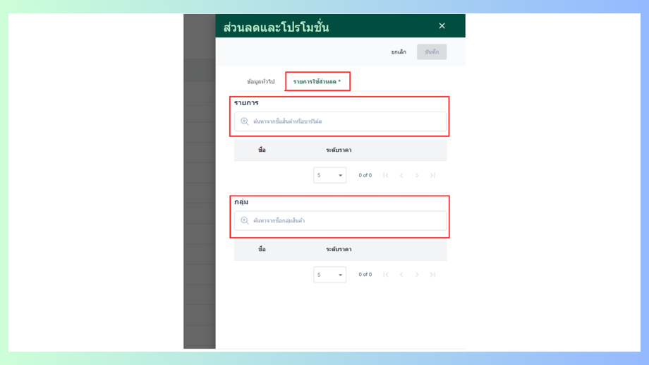 - รายการใช้ส่วนลด เลือกรายการค้นหาชื่อสินค้าหรือกลุ่มสินค้า สามารถกำหนดระยะเวลาได้