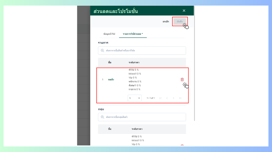 - ผู้ใช้งานสามารถเลือกส่วนลดตามกลุ่มได้