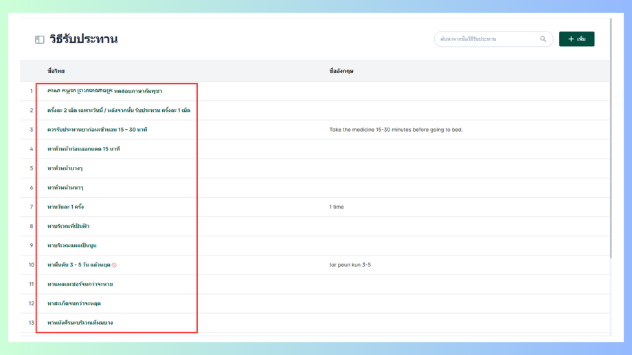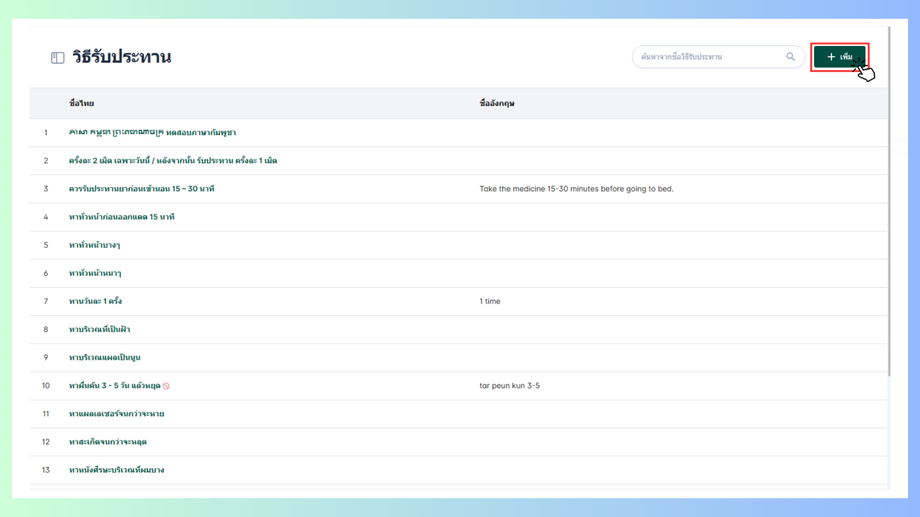 ผู้ใช้งานจะเข้าสู่หน้าวิธีรับประทาน จากนั้นกดที่ปุ่มเพิ่มทางด้านขวา