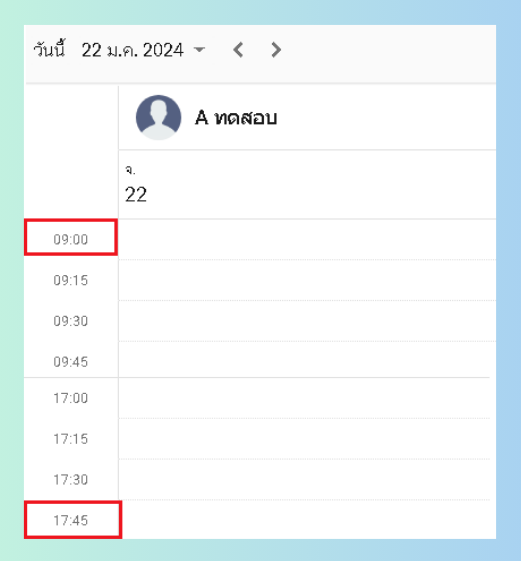 ตัวอย่าง : หากผู้ใช้งานทำการตั้งค่าเวลาทำการ 9.00 - 18.00 ในเมนูนัดหมาย ระบบจะแสดงเวลาเริ่มต้นที่ 9.00 และ สุดที่ 17.45