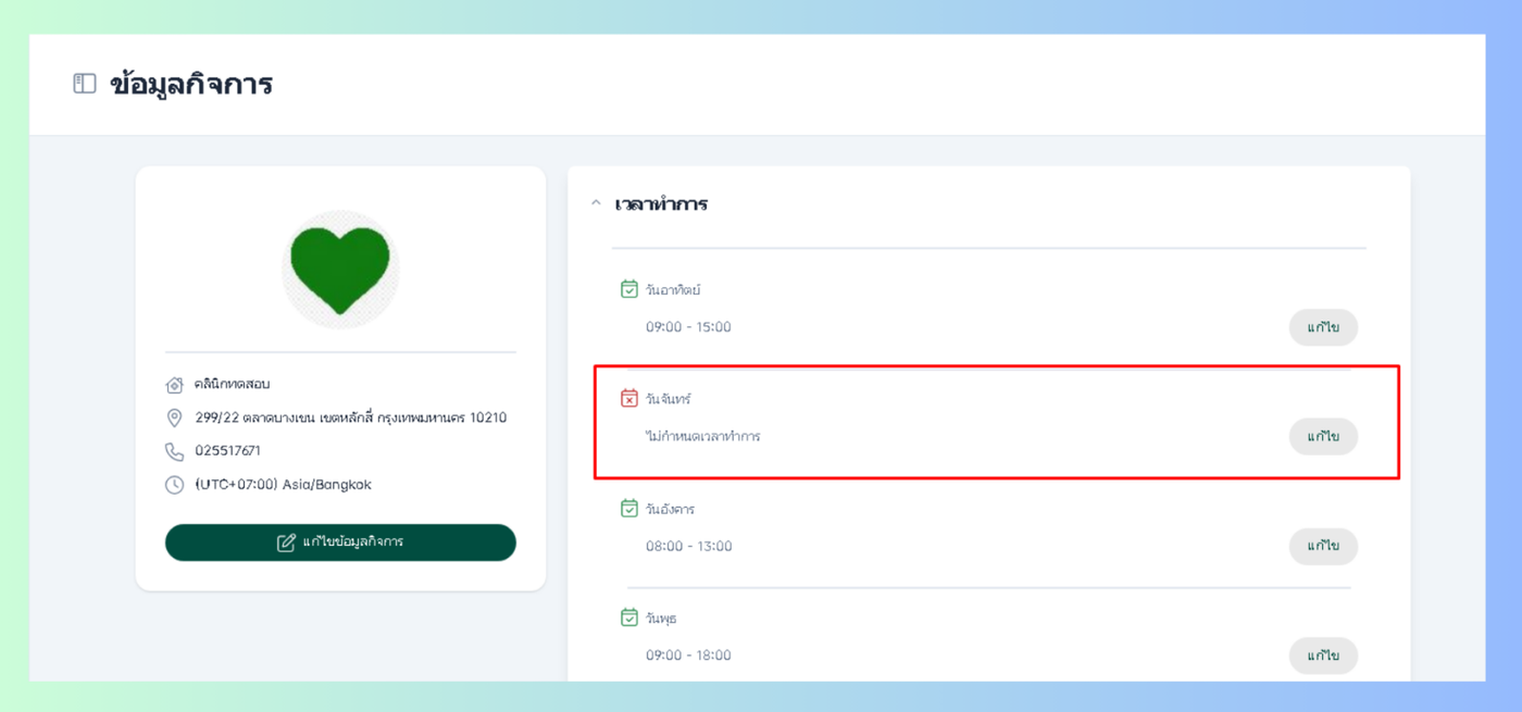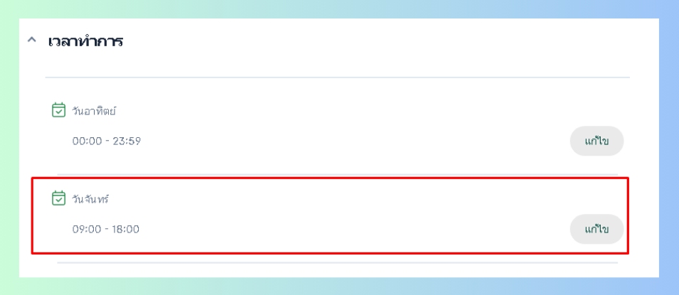 เข้าสู่หน้ากิจการเลือกที่หัวข้อเวลาทำการเลือกวันจากนั้นคลิกที่เเก้ไข