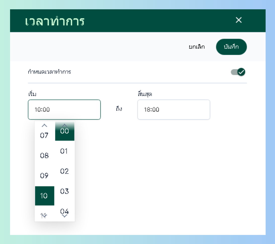 กรอกเวลาเริ่มทำการและสิ้นสุดได้ตามต้องการ จากนั้นคลิกที่บันทึก