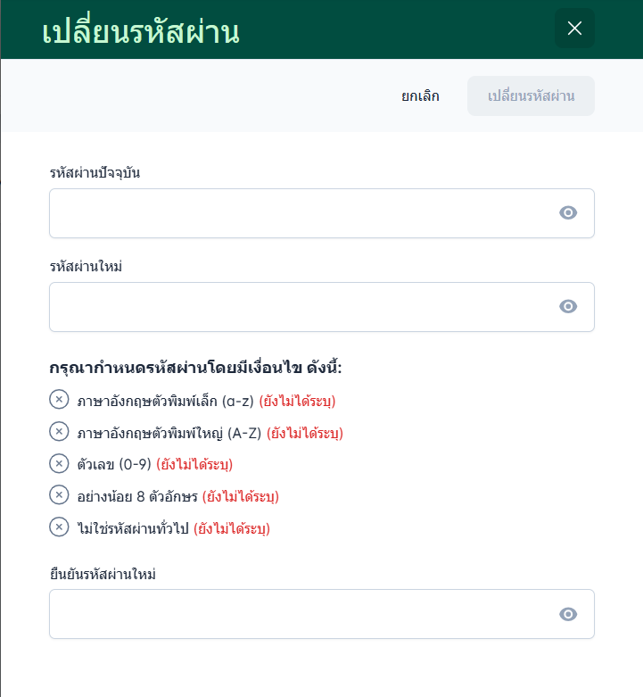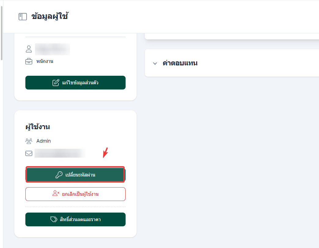 การเปลี่ยนรหัสผ่าน เปลี่ยนรหัสผ่านมีขั้นตอนดังต่อไปนี้ไปที่รูปการตั้งค่าไปที่หัวข้อทีมงาน จากนั้นเลือก พนักงานคลิกที่ชื่อพนักงานที่ต้องการ จากนั้น คลิกเลือก เปลี่ยนรหัสผ่าน ระบุรหัสผ่านปัจจุบัน รหัสผ่านใหม่ และยืนยันรหัสผ่านใหม่คลิกเปลี่ยนรหัสผ่าน