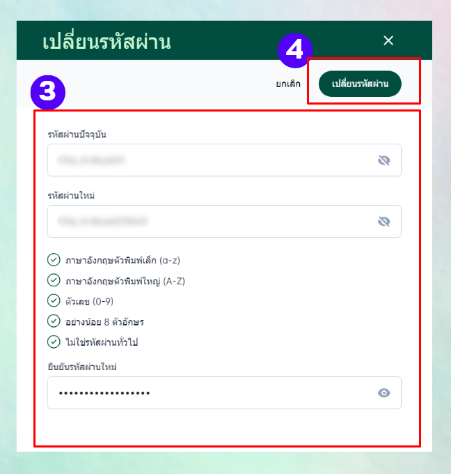 การเปลี่ยนรหัสผ่าน เปลี่ยนรหัสผ่าน หน้าเมนูเลือกที่ตั้งค่า เลือกเปลี่ยนรหัสผ่าน ระบุรหัสผ่านปัจจุบัน รหัสผ่านใหม่ และยืนยันรหัสผ่านใหม่ คลิกเปลี่ยนรหัสผ่าน r g