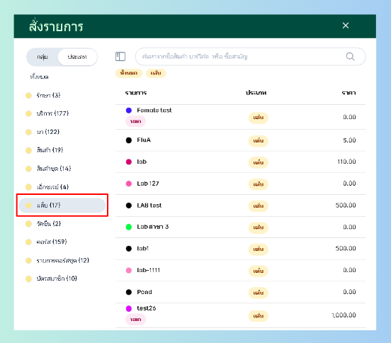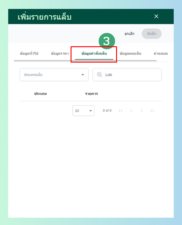 3. ข้อมูลคำสั่งแล็บ เลือกประเภทแล็บ และค้นหาชื่อแล็บที่ต้องการ
