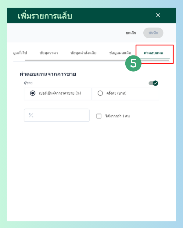 5. ค่าตอบแทน สามารถเลือกปิดหรือเปิดการให้ค่าตอบแทนได้ โดยกดที่ไอคอนในกรอบสีน้ำเงินดังภาพ และหากเลือกให้ค่าตอบแทนกรุณาระบุข้อมูลให้ครบถ้วน โดยสามารถมีผู้รับค่าตอบได้มากว่า 1 คน