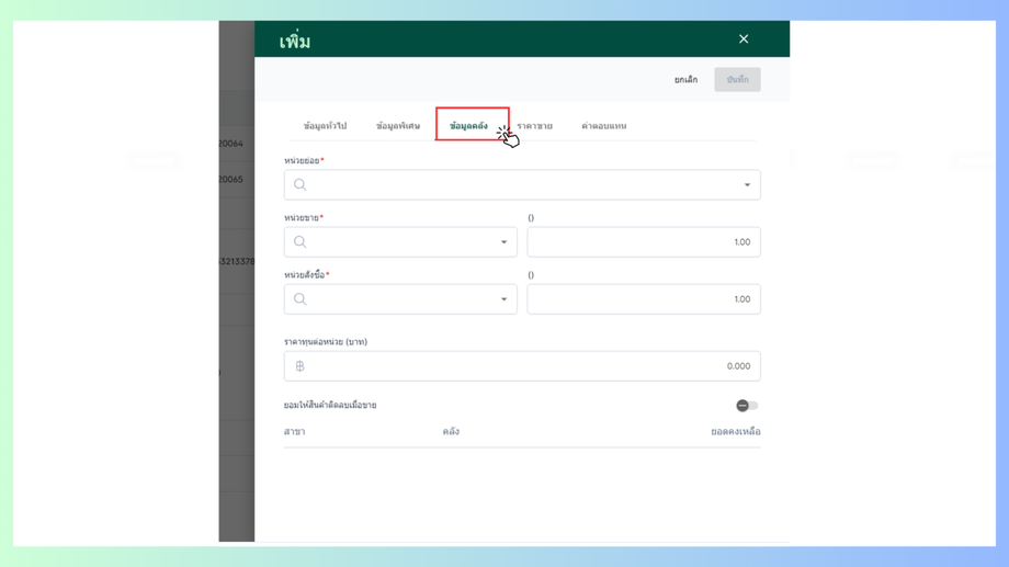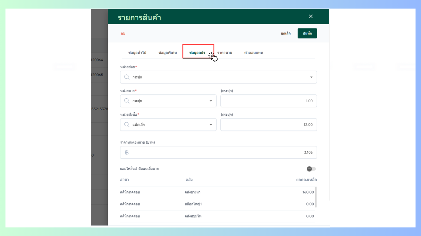 - รายละเอียดข้อมูลคลัง หน่วยย่อย หน่วยขาย หน่วยสั่งซื้อ