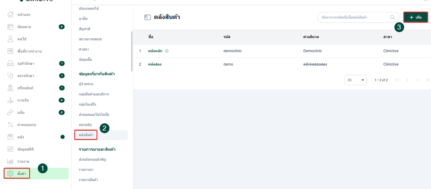 การกำหนดจุดจัดเก็บยาและเวชภัณฑ์ให้เป็นสัดส่วน โดยระบุข้อมูลสำคัญ เช่น รหัสคลัง ชื่อคลัง และสาขาที่เข้าถึงคลังได้ ซึ่งข้อมูลเหล่านี้จะแสดงเป็นตัวเลือกหลักในขั้นตอนการจัดการคลัง ช่วยให้ผู้ใช้งานสามารถโอนย้าย ตรวจนับ และติดตามยอดคงเหลือของสินค้าในแต่ละจุดจัดเก็บได้อย่างถูกต้องและเป็นระบบ