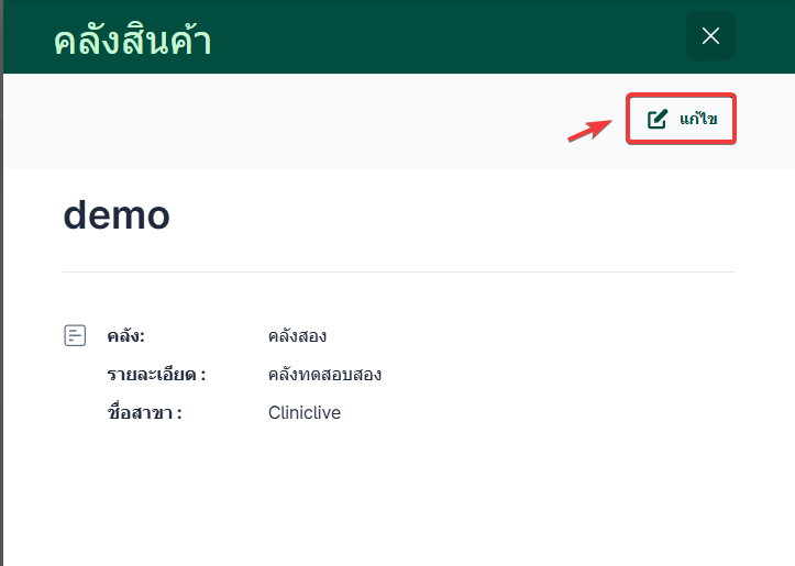 เมื่อผู้ใช้อยู่ในหน้าคลังสินค้า เลือกคลังสินค้าที่ต้องการแก้ไขจะมีหน้าต่างแสดงข้อมูลขึ้นมา