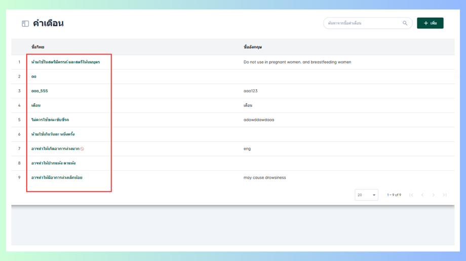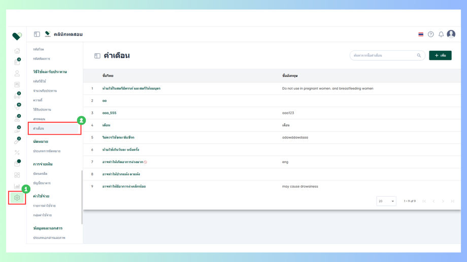 การตั้งค่าคำเตือน คือระบุคำเตือนในการใช้ยา จะเป็นการบันทึกข้อมูลเพื่อไปเรียกใช้ในส่วน คำเตือนเพื่อไปผูกกับรายการยา และ แสดงผลการพิมพ์ฉลากยา