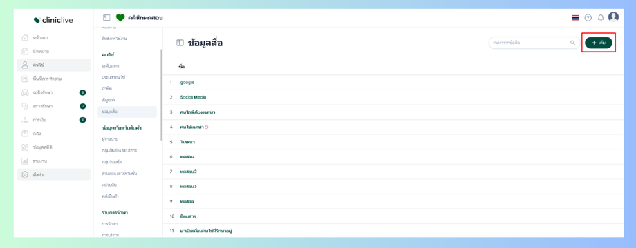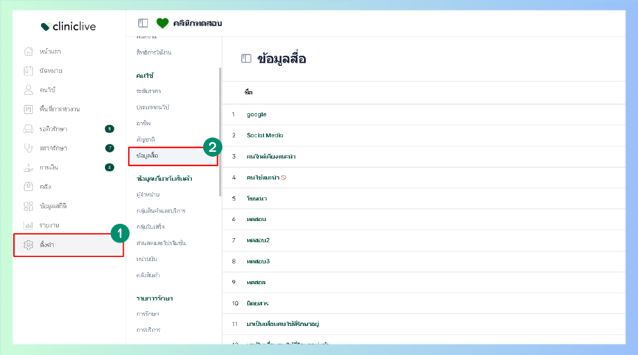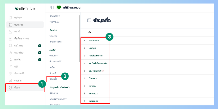 ข้อมูลสื่อ คือ แหล่งที่มาของลูกค้าหรือคนไข้ว่าเข้ามาใช้บริการเรานั้น ได้เห็นข้อมูลที่ทำการเราจะข้อมูลสื่อหรือทราบมาจากส่วนไหน