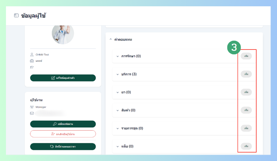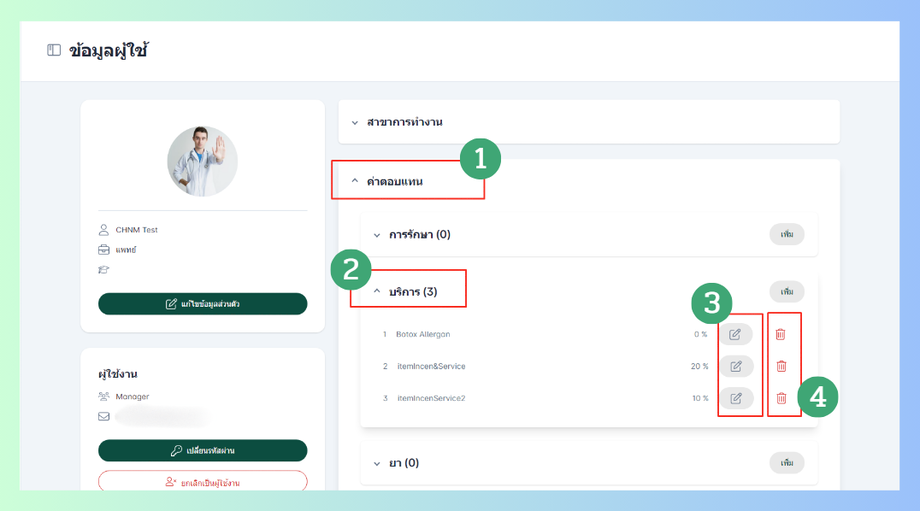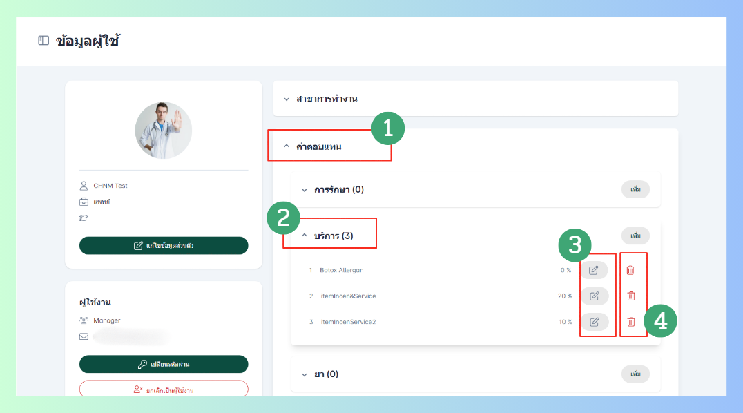 - ผู้ใช้งานสามารถกำหนดค่าตอบแทนของแต่ละท่านได้ เพื่อให้ในขั้นตอนการสั่งรายการ ระบบจะบันทึกค่าตอบแทนตามการตั้งค่าของผู้ใช้งาน