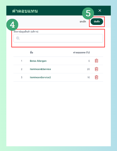 ผู้ใช้งานสามารถกำหนดค่าตอบแทนของรายการสินค้าหรือบริการให้กับพนักงานแต่ละท่าน และ กำหนดราคาค่าตอบแทนเพื่อให้ในขั้นตอนการสั่งรายการ ระบบจะบันทึกค่าตอบแทนตามการตั้งค่าของผู้ใช้งาน