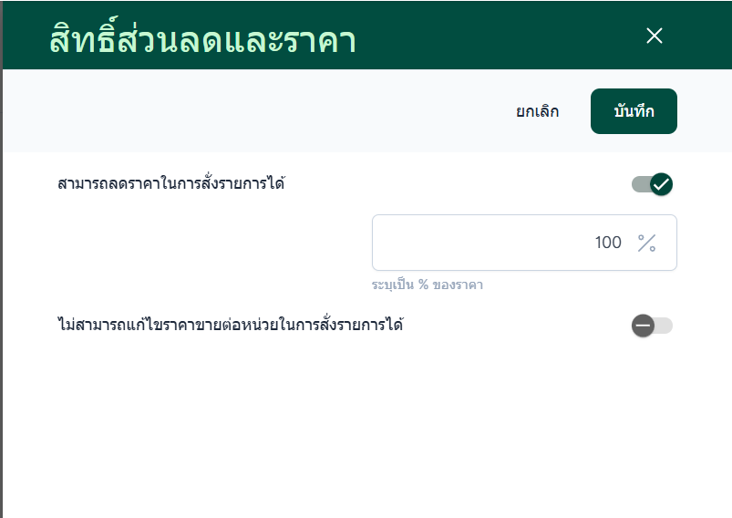 เปิด/ปิด การลดราคาในการสั่งรายการได้ แต่เมื่อกดเปิดจำเป็นต้องระบุเปอร์เซ็นต์ส่วนลดที่ต้องการลดราคา
