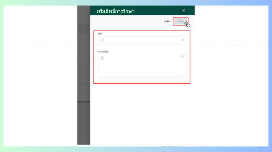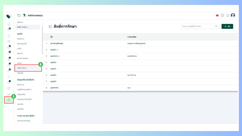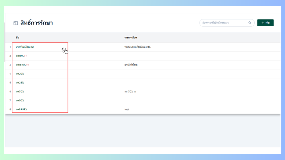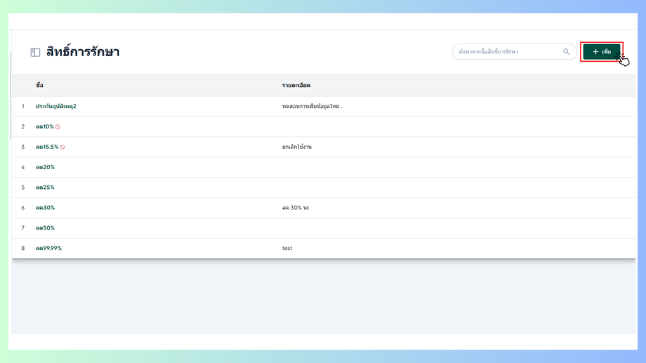เมื่อผู้ใช้อยู่ในหน้าสิทธิ์การรักษาคลิก +เพิ่มที่มุมขวาบน