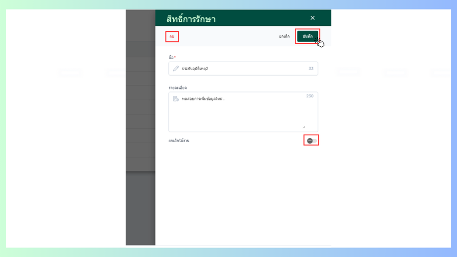 ผู้ใช้งานจะสามารถตั้งประเภทสิทธิ์การรักษาที่ทำการตั้งค่าไว้ได้