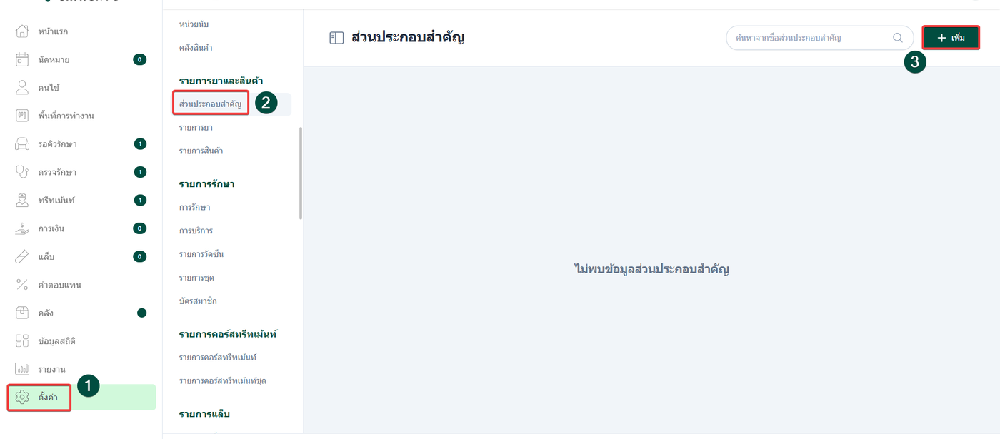 เมื่อผู้ใช้อยู่ในหน้าส่วนประกอบสำคัญคลิกที่ +เพิ่ม