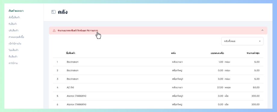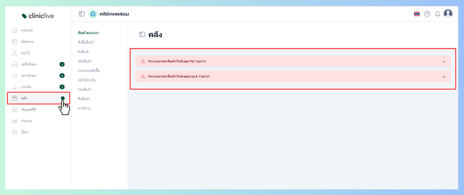โดยเมื่อมี ยาและสินค้าใกล้หมด และ ยาและสินค้าใกล้หมดอายุ ระบบจะมีการแจ้งเตือนเป็นรูปวงกลม ที่เมนูคลัง tab ด้านซ้ายมือ