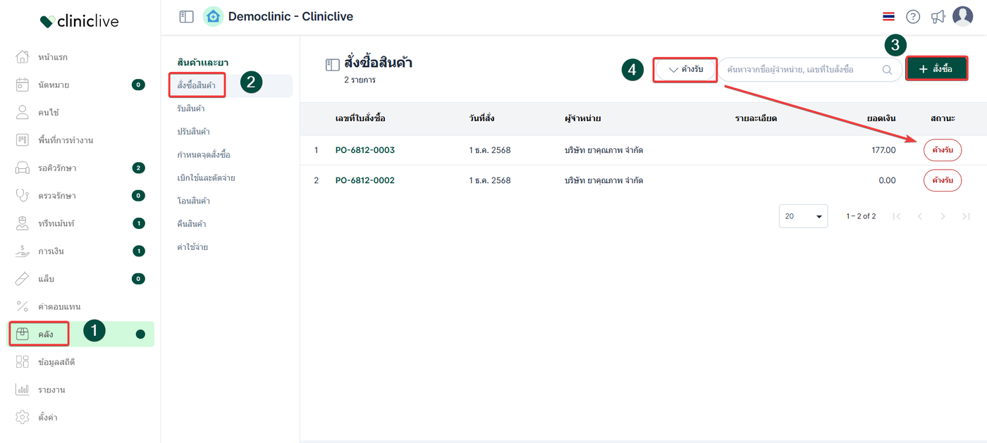 สามารถเลือกสถานะของคำสั่งซื้อที่ต้องการแสดง ได้จากเมนูแบบดรอปดาวน์ เช่น ค้างรับ รับครบ