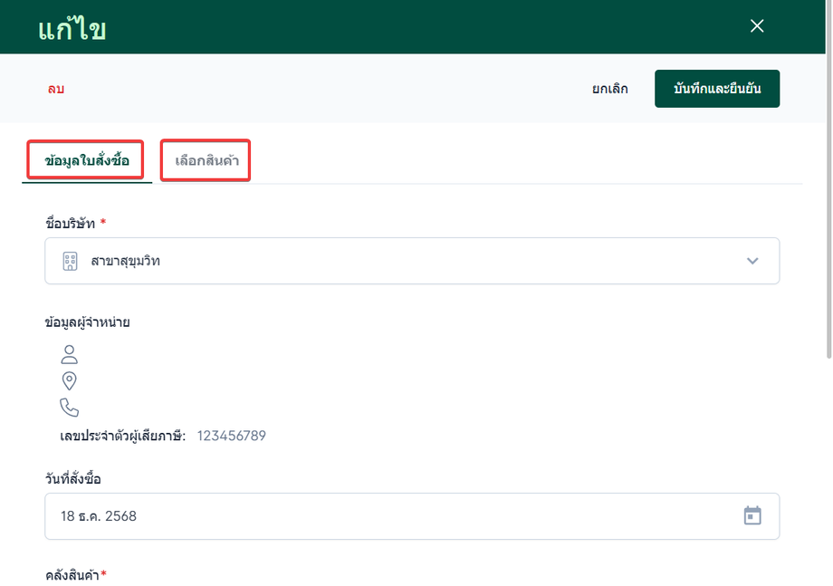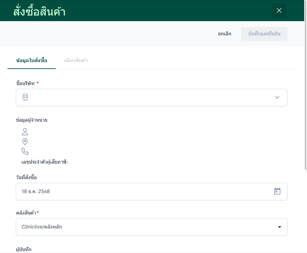 ให้ผู้ใช้งานระบุข้อมูลชื่อบริษัท(ผู้จำหน่าย) การตั้งค่าผู้จำหน่าย ระบบจะแสดงข้อมูลผู้จำหน่ายขึ้น ระบุวันที่สั่งซื้อ เลือกคลังสินค้า การตั้งค่าข้อมูลคลังสินค้า และ ระบุผู้บันทึก