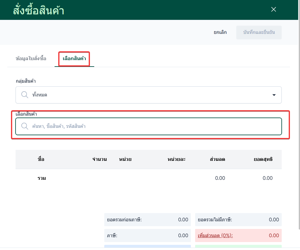 และเลือก สั่งซื้อสินค้า ระบบจะพาเข้าสู่หน้าสั่งซื้อสินค้าเพื่อดำเนินการบันทึกคำสั่งซื้อ