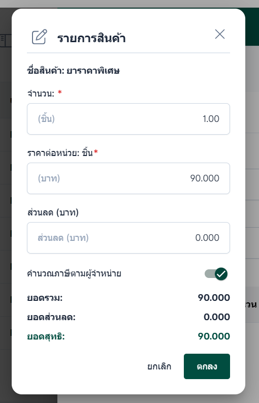 เมื่อผู้ใช้ระบุเรียบร้อยแล้วกดตกลง ระบบจะทำการบันทึกรายการสินค้า จำนวน ราคาทุนต่อหน่วย