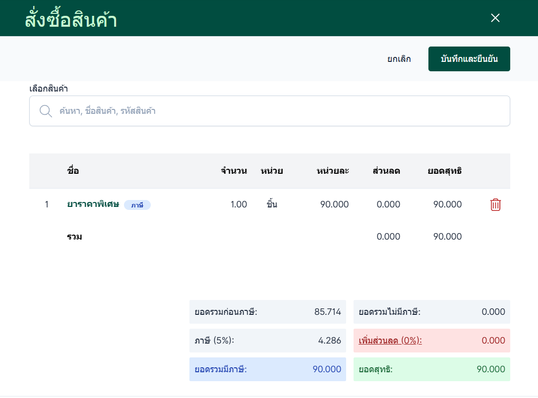 หากเป็นสินค้า ที่ยังไม่เคยมีประวัติการสั่งซื้อ มาก่อน ราคาต่อหน่วยจะแสดงเป็น 0 เพื่อให้ผู้ใช้งานระบุราคาใหม่ด้วยตนเอง