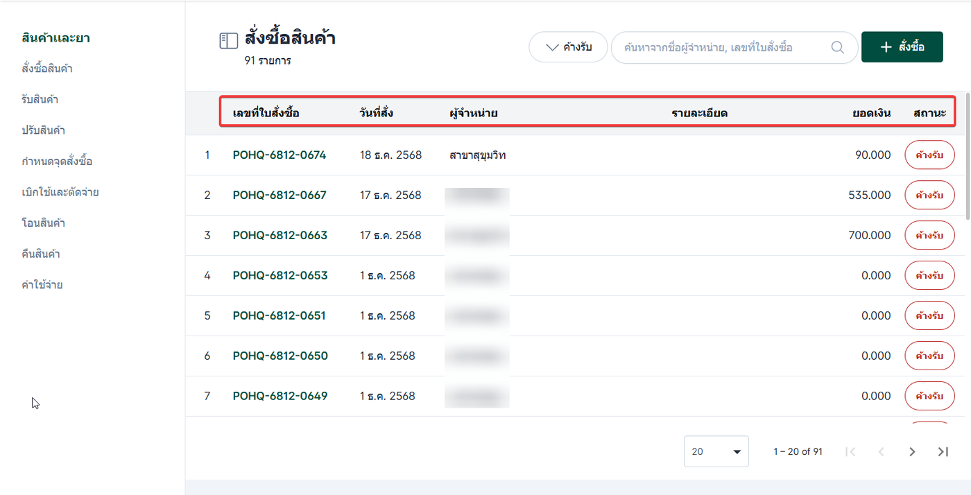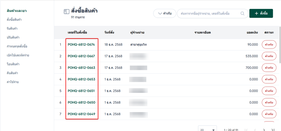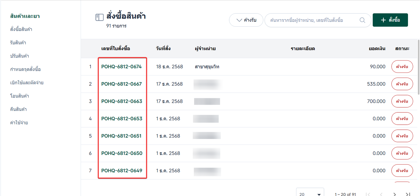 ผู้ใช้งานสามารถ คลิกที่เลขที่ใบสั่งซื้อ เพื่อเข้าสู่หน้ารายละเอียดของใบสั่งซื้อ