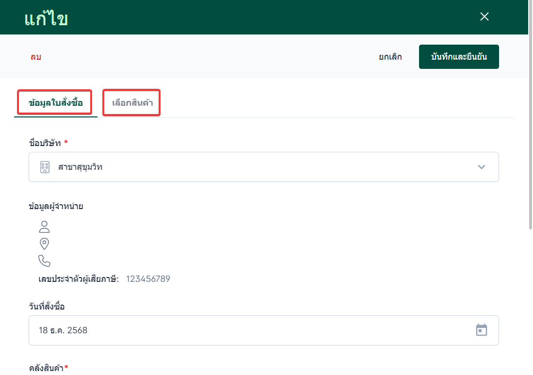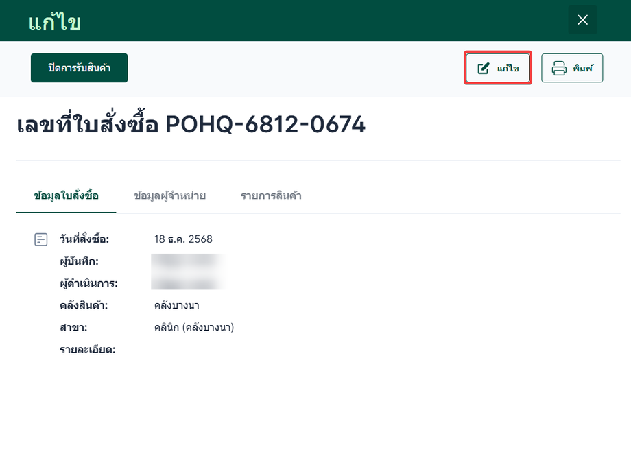 ระบบจะแสดงหน้าข้อมูลใบสั่งซื้อสินค้า จากนั้นคลิกที่มุมขวาบน "กดแก้ไข"