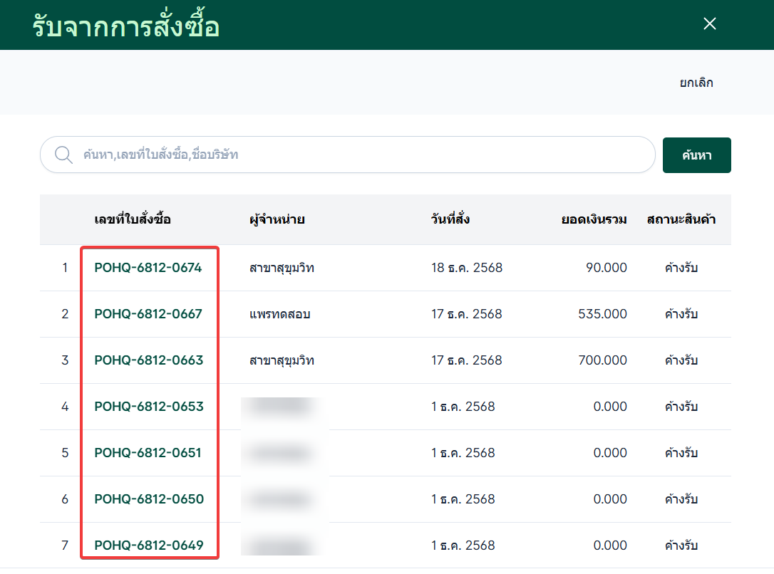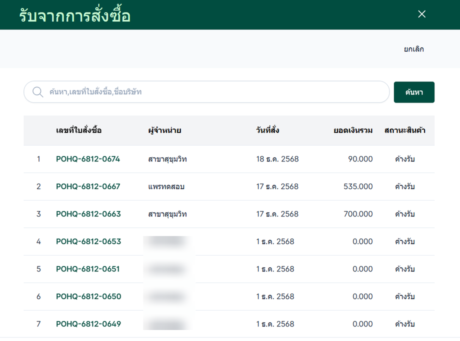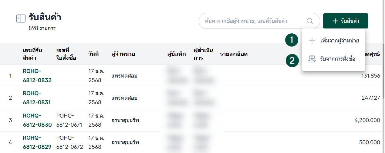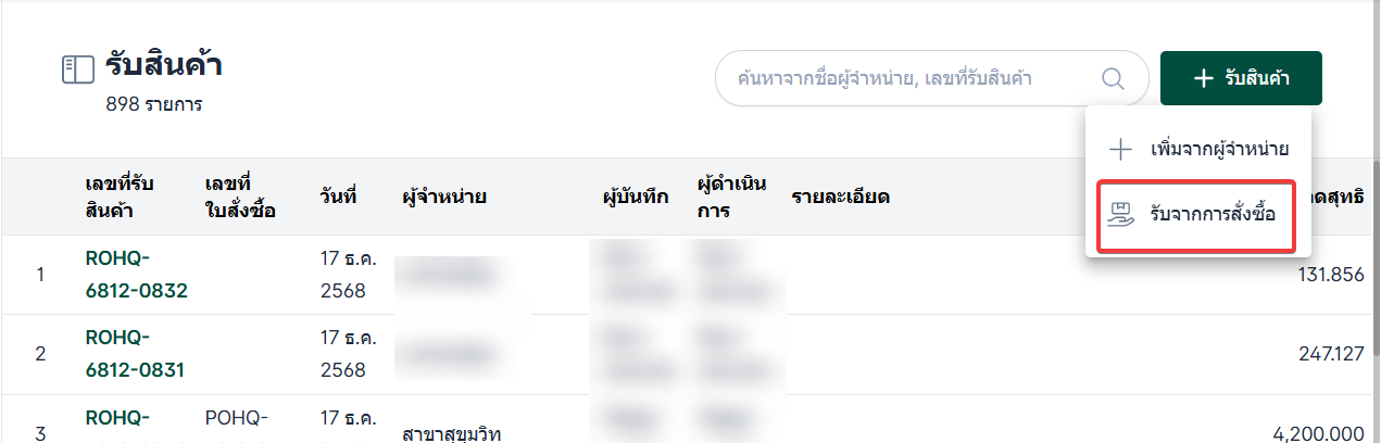 ในกรณีที่รับสินค้าจาก การสั่งซื้อที่มีอยู่ก่อนหน้า ผู้ใช้งานสามารถเลือกช่องทาง รับจากการสั่งซื้อ ได้