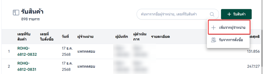 เพิ่มจากผู้จำหน่าย เป็นการรับสินค้าที่ ไม่ได้มีการสั่งซื้อไว้ล่วงหน้า หรือใช้ในกรณีที่เป็น การรับสินค้าครั้งแรก โดยผู้ใช้งานสามารถบันทึกรายการรับสินค้าและข้อมูลผู้จำหน่ายได้โดยตรง