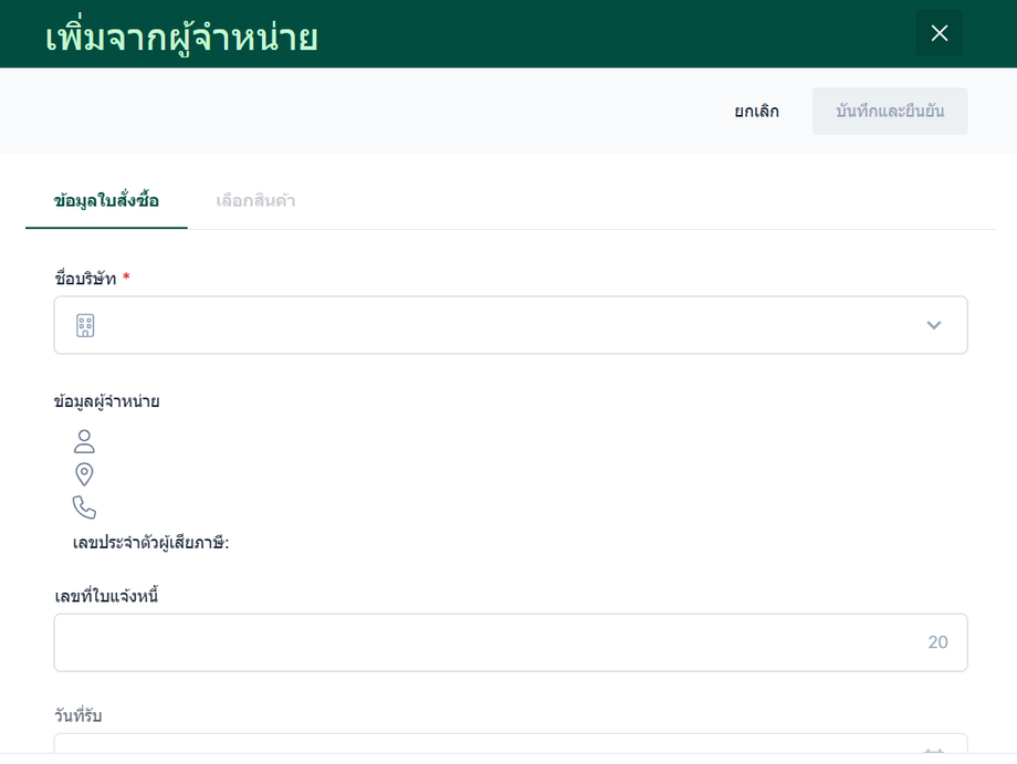 ชื่อบริษัท (ผู้จำหน่าย) เลือกจากข้อมูลผู้จำหน่ายที่ได้ตั้งค่าไว้ (การตั้งค่าผู้จำหน่าย )