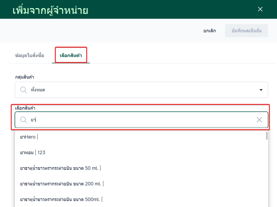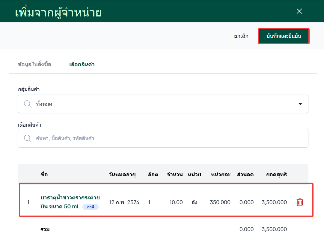 เลือกสินค้าเพิ่มเติมได้ เมื่อเลือกเสร็จแล้วกดปุ่มบันทึกระบบจะทำการบันทึกข้อมูลการรับสินค้า