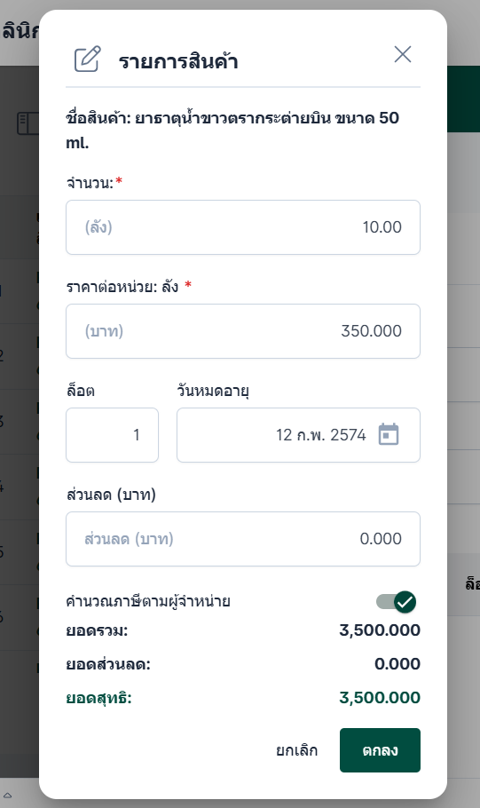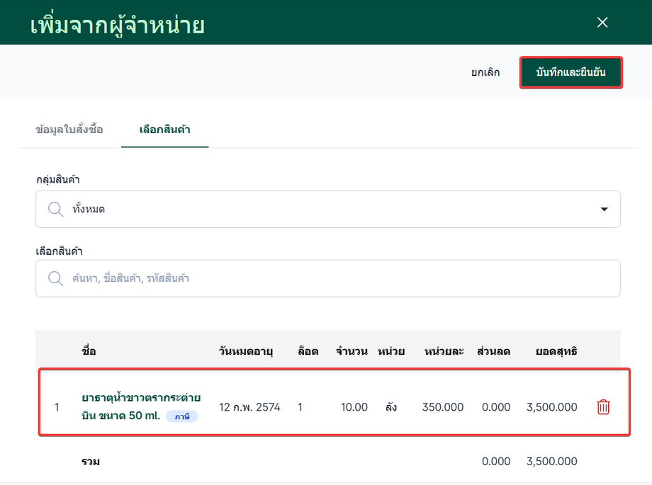 เมื่อผู้ใช้ระบุเรียบร้อยแล้วกด "ตกลง" ระบบจะทำการบันทึกรายการสินค้า