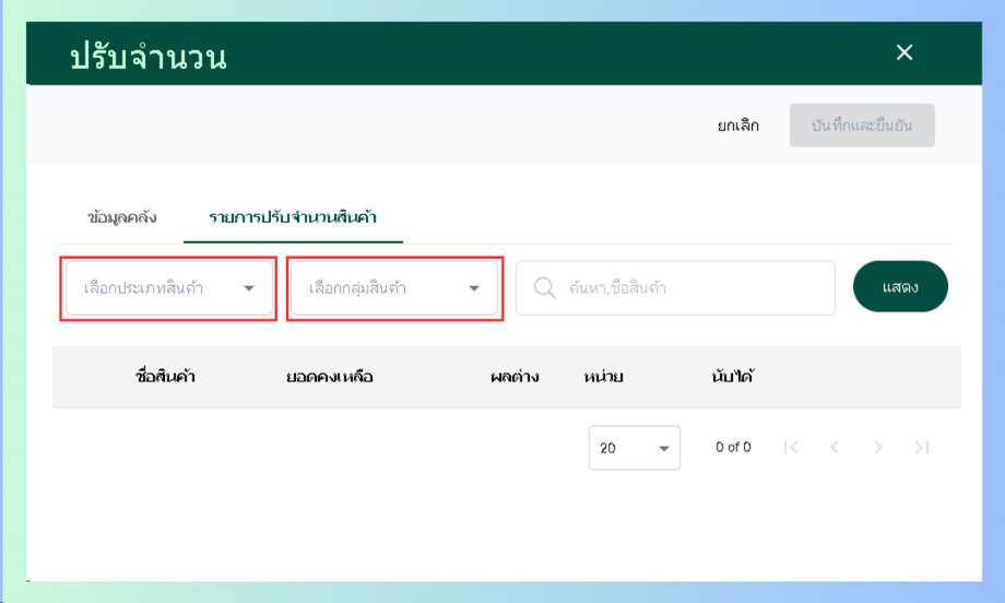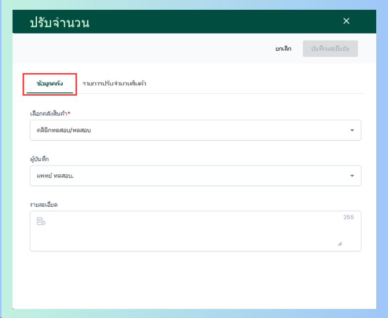 ระบบจะแสดงหน้าปรับจำนวนให้ผู้ใช้เลือกคลังสินค้า ผู้บันทึก และรายละเอียด