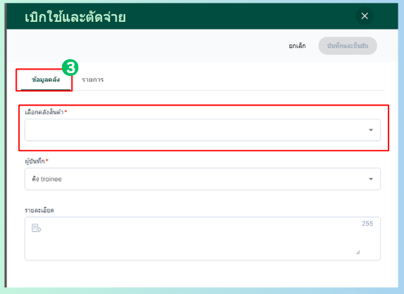 ข้อมูลคลัง ในส่วนของข้อมูลคลัง เลือกคลังสินค้า ผู้บันทึก และสามารถใส่รายละเอียดเพิ่มเติมได้ เช่น ยาหมดอายุ อุปกรณ์ชำรุด เป็นต้น