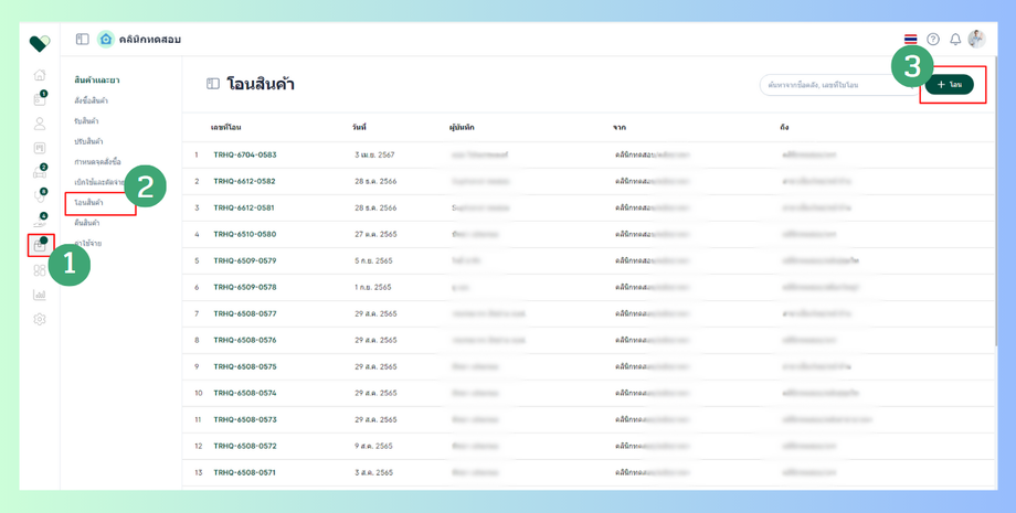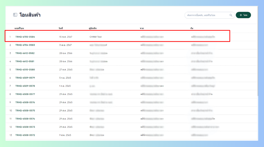 ผู้ใช้งานจะเข้าสู่หน้าโอนสินค้า จากนั้นกด" +โอน "ที่ด้านขวาบน
