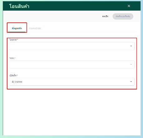 ข้อมูลคลัง ระบุว่าโอนจากที่ไหน ไปยังที่ไหน และเลือกว่าผู้บันทึกคือใคร
