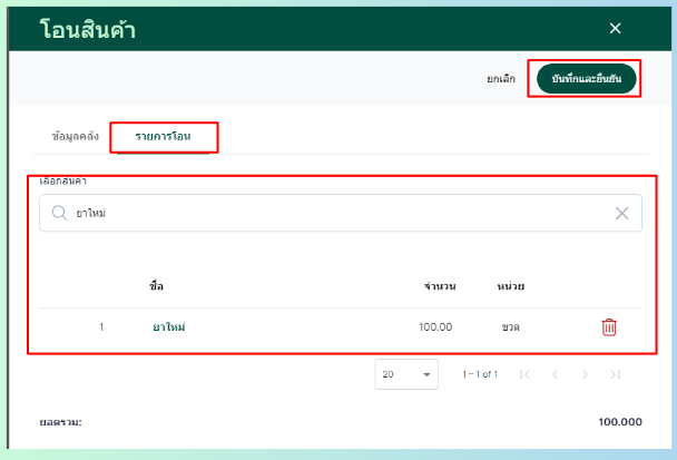 รายการโอน เลือกรายการสินค้าที่ต้องการโอน และระบุจำนวณที่ต้องการโอน