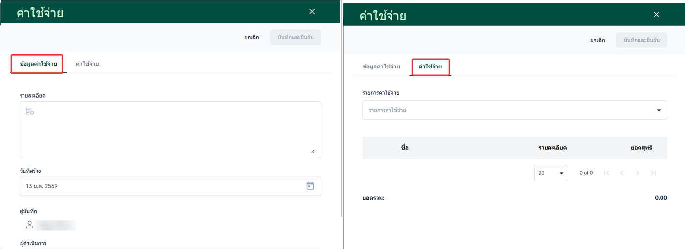 ข้อมูลค่าใช้จ่าย ระบุรายละเอียด วันที่สร้าง และผู้บันทึกคือใคร เลือกผู้ดำเนินการ