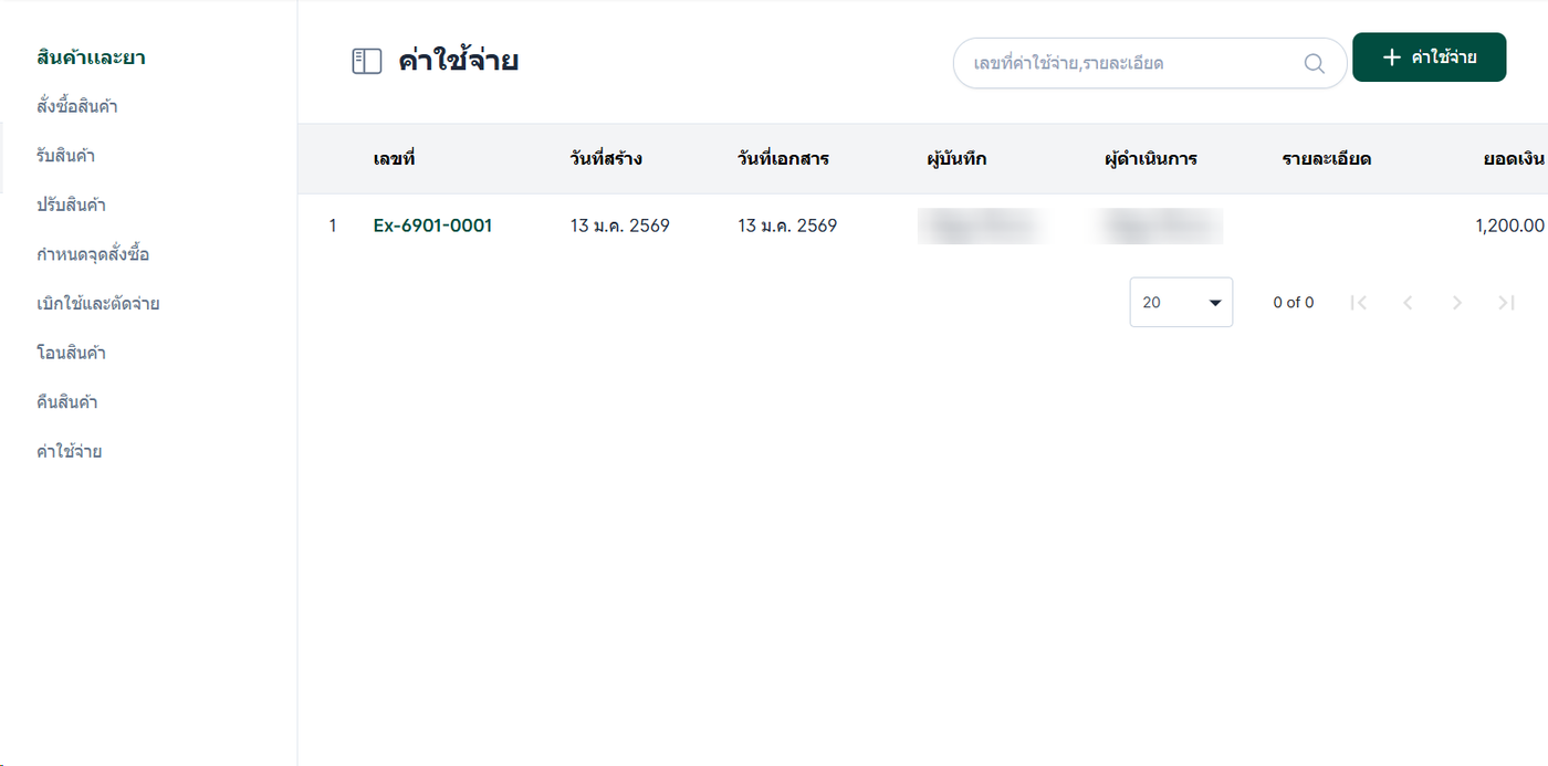 ระบบจะเข้าสู่หน้าโอนสินค้า คลิกปุ่ม + ค่าใช้จ่าย ที่มุมขวาบน เพื่อเริ่มทำรายการค่าใช้จ่าย