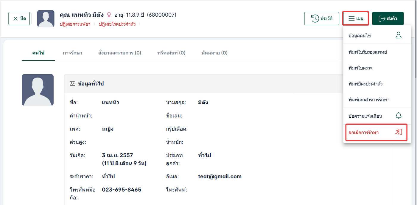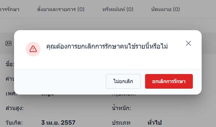 เลือกผู้ป่วยที่ต้องการยกเลิกการรักษา โดยคลิกที่ ชื่อคนไข้