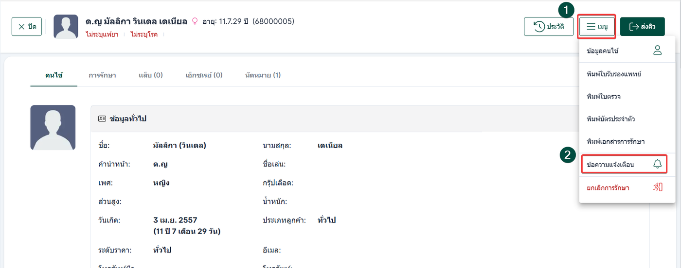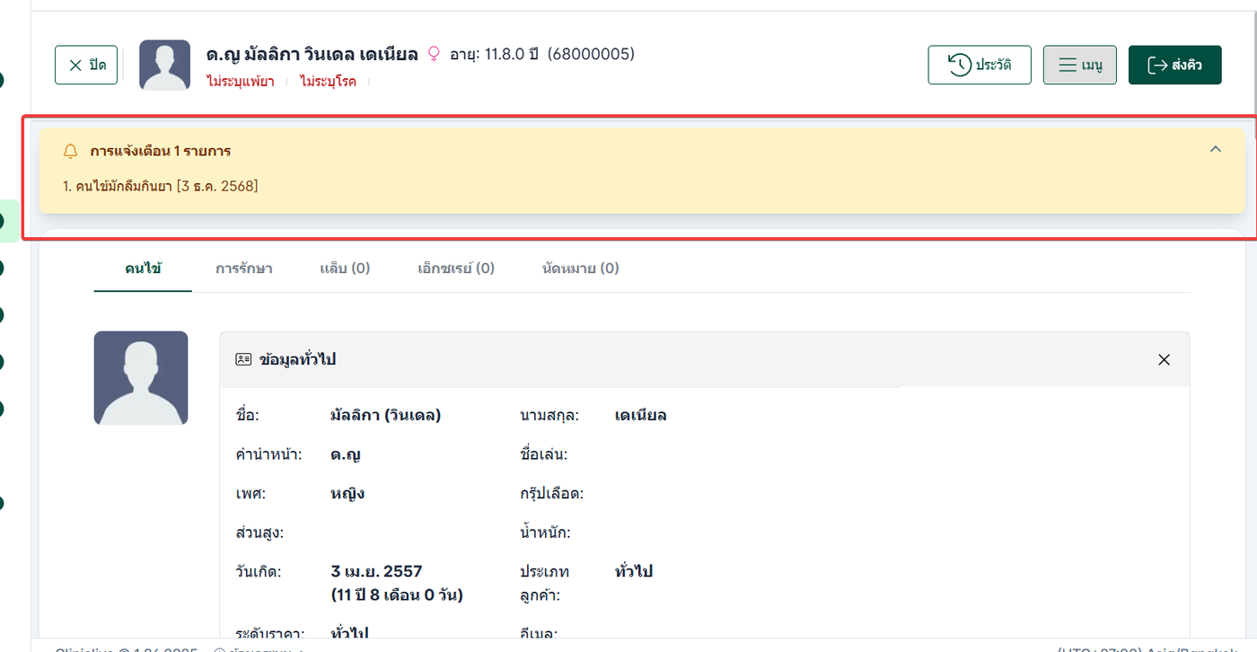 เมื่อผู้ใช้งานทำการเพิ่มข้อความแจ้งเตือนของคนไข้แล้ว ระบบจะแสดงข้อความแจ้งเตือนทุกครั้งเมื่อมีการเข้ามาที่คนไข้ที่เพิ่มข้อความแจ้งเตือนไว้