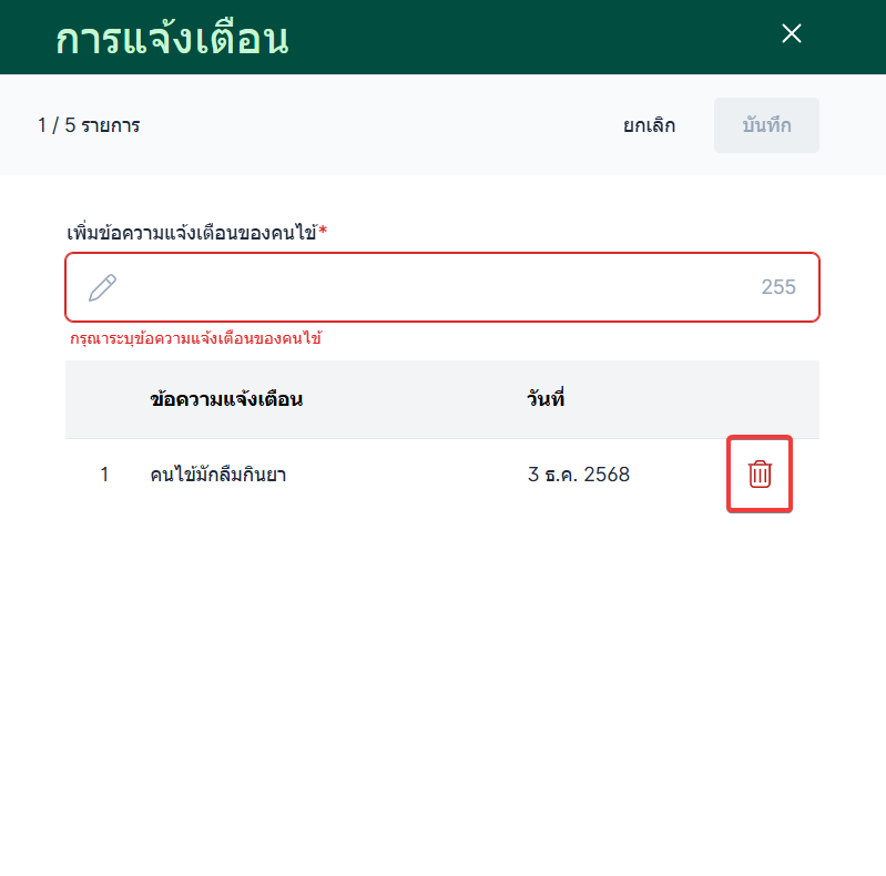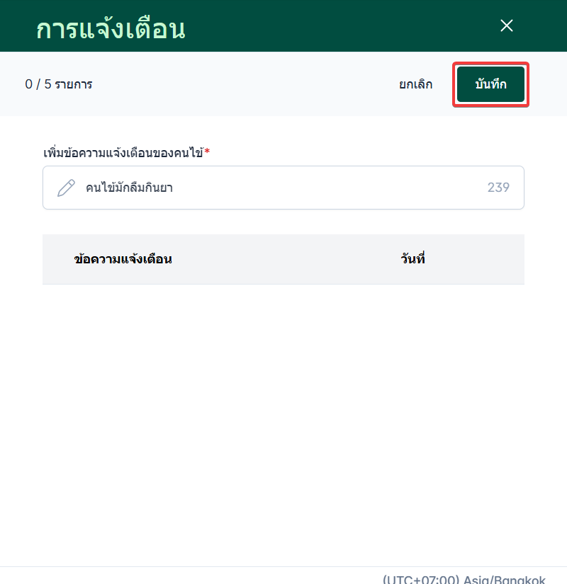 มื่อคลิกเลือกข้อความแจ้งเตือนแล้วจะมีหน้าหน้าขึ้นมาให้เพิ่มข้อความแจ้งเตือนของคนไข้ เมื่อเพิ่มข้อมูลแล้วกดบันทึก
